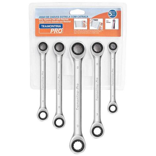 Jogo Chave Estrela Com Catraca 5 Peças Tramontina 44634505 Características: 1. As chaves de aperto são produzidas em aço ligado com cromo vanádio cr-v , e apos submetidas a testes rigorosos de torque para atender a norma din 1711-1. 2. O novo perfil hyper drive, em alguns modelos de boca tipo estrela, reduz a fadiga das chaves, prolongando sua vida útil. 3. O teste de dureza é realizado em vários pontos para assegurar a resistência ao desgaste da chave durante o uso ininterrupto. 4. Alguns tipos de chaves de aperto são fornecidos em bitolas métricas e em polegadas, para os diversos fixadores disponíveis. 5. Devido à incorporação de um mecanismo com catraca, esta ferramenta permite realizar trabalhos com mais agilidade e facilidade do que uma chave estrela comum. 6. Não é indicada para dar apertos finais. 7. As ferramentas são produzidas e testadas conforme normas específicas. Ean: 7891114064056