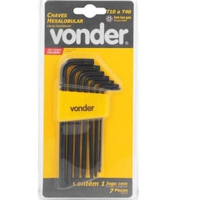 1 jogo de chaves hexalobular, composto por um suporte plástico com 7 peças, sendo: t10 - t15 - t20 - t25 - t27 - t30 e t40