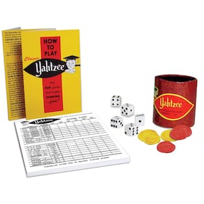 Yahtzee clássico com arte retrô, um emocionante jogo de habilidade e azar com componentes autênticos, da Winning Moves Games USA, para maiores de 8 anos, 2 ou mais jogadores (1167) - FAVORITO DE TODOS OS TEMPOS DA FAMÍLIA: Classic Yahtzee é o jogo de dados mais vendido e famoso de todos os tempos. Famílias e amigos apreciam esse ícone americano desde os fabulosos anos 50! - O CONTEXTO: A sorte desempenha um grande papel em Yahtzee, mas a estratégia faz uma grande diferença. Você marca cada combinação apenas uma vez, e o número de combinações diferentes que você pode marcar é igual ao número de turnos no jogo. - O JOGO: Lance todos os 5 dados no seu turno. Se você não gostar do que jogou, pode guardar qualquer quantidade de dados e rolar o resto até mais 2 vezes! - RITMO RÁPIDO: O jogo termina após cada jogador ter 13 turnos e preencher todas as caixas da coluna com uma pontuação ou zero. O jogador ou equipe com a maior pontuação total em todos os jogos (até seis) vence! - QUAIS SÃO AS CHANCES? : Você sabia que as chances de lançar um “Yahtzee” (5 OF A KIND) em sua primeira jogada são de 1295 para 1? Então você não verá isso acontecer com muita frequência! - Copo de dados com borda de alumínio, cinco dados brancos, bloco de notas, oito fichas de bônus (4 vermelhas, 4 amarelas), bandeja de armazenamento, folha de instruções - Introduzida há mais de cinquenta anos