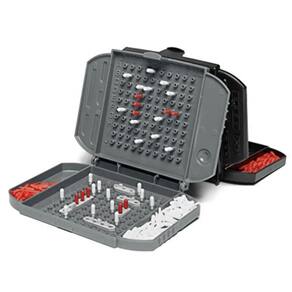 Jogabilidade clássica em formato de bolso. Este jogo pode ser levado para jogar onde quiser. Esta versão usa as mesmas regras do jogo Battleship autêntico. O jogador deve afundar a frota de 5 navios do inimigo antes que ele afunde a sua. O jogadores deve posicionar todas as suas unidades navais estrategicamente e tentar fazer lançamentos precisos contar a frota do inimigo. Para crianças a partir dos 7 anos. O jogo Battleship Grab & Go para 2 jogadores é uma excelente opção para passar o tempo em viagem de avião, comboio ou carro, além de acampamentos e férias. É fácil de preparar e de guardar. Depois do jogo, basta guardar as peças nos estojos. Quem comandará os oceanos do jogo Battleship Grab and Go?