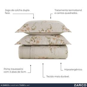 Características: . Jogo de colcha dupla face com tratamento termobond e cantos quadrados; . Porta-travesseiro com 3 abas de 5cm; . Hipoalergênico; . Altamento respirável; . Caimento perfeito.