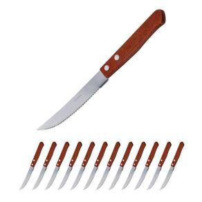 Jogo com 12 Facas de Mesa em Aço Inox e Cabo de Madeira Jogo com 12 Facas de Mesa em Aço Inox e Cabo de Madeira ===================================== Esta faca é produzido em aço inoxidável de alta qualidade, um material conhecido por sua resistência, durabilidade e brilho natural, que garante excelente desempenho no uso diário sem perder a elegância.