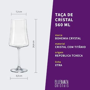 Jogo com 12 taças de cristal para água 560 ml linha xtra bohemia Jogo com 6 taças de cristal para água com 560 ml da linha xtra bohemia crystal Resistência titânio e cristal ecológico Detalhes do produto Material: cristal com titânio, mais resistente que o cristal comum Origem: produto da república tcheca Produto: taças de cristal Quantidade: 06 taças Capacidade: 560 ml cada taça Tamanho: 24,4 cm de altura, 7,3 cm de diâmetro de bocal e 8,9 cm de diâmetro de base Marca: bohemia crystal Linha: xtra Embalagem: os produtos são cuidadosamente envolvidos por plástico bolha e entregues na caixa do fabricante, inserida em outra caixa reforçada para assegurar a integridade do produto no transporte. Substituímos produtos danificados no transporte. Postamos nossos produtos nos correios de 01 a 02 dias úteis após a compra. Todos os nossos produtos acompanham a impressa. Trocas e devoluções Seguimos todas as normas vigentes no código de defesa do consumidor. Adicionalmente, trocamos produtos danificados no transporte. Informações relevantes 1. Já imaginou beber ou servir suas bebidas em taças ou copos de cristal com classe e sofisticação A elleganza cristais comercializa produtos com preços excepcionalmente abaixo do mercado, de qualidade assegurada pela marca tcheca bohemia crystal. Após anos de pesquisa e desenvolvimento, distribui em mais de 100 países cristal de espessura bem fina, livre de materiais tóxicos, com design e transparência incríveis. 2. Mas cristal não quebra facilmente Não. O cristal com titânio é muito mais resistente a impactos e mudanças de temperatura se comparado ao cristal comum, proporcionando maior segurança e comodidade no manuseio. A elleganza cristais trabalha apenas com produtos contendo titânio em sua composição, trazendo excelência e qualidade a preços imbatíveis. Sobre a bohemia crystal A bohemia crystal é líder global no mercado de cristais, com atuação em mais de 100 países. Fabrica seus produtos na república tcheca e realiza altos investimentos no desenvolvimento e melhoramento de seus produtos para garantir-lhes qualidade de ponta e ser referência global de qualidade e sofisticação. Eles foram os precursores do movimento que tornou o cristal um material ecológico, sem materiais tóxicos em sua composição. Também se destacam de outras marcas ao adicionar titânio para seus produtos mais especiais e assegurar resistência muito superior ao cristal comum. A marca oferece aos seus clientes uma vasta ampla variedade de produtos, desde utensílios domésticos a itens para indústria química. Cada linha de produto tem sua embalagem personalizada de acordo com suas características e tamanho.