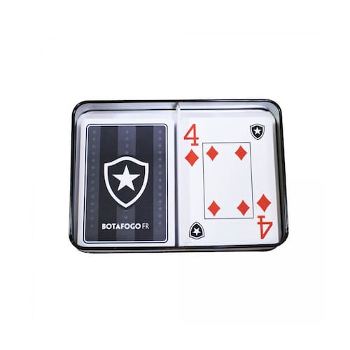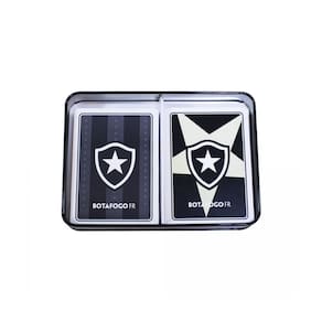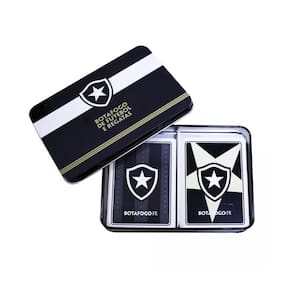 Jogo com 2 baralhos na lata de metal. Precisando de cartas para jogar com os amigos. Olha este jogo com 2 baralhos de plástico customizados. Vêm dentro de uma lata de metal que também é no tema do clube. Quer mais, Os Jokers são na imagem do mascote do time e os baralhos possuem estampas diferentes na parte de trás. Material, plástico e metal. Medidas- ALT 20 LAR 15 COM 8 peso 300gr Ean: 4894290244222