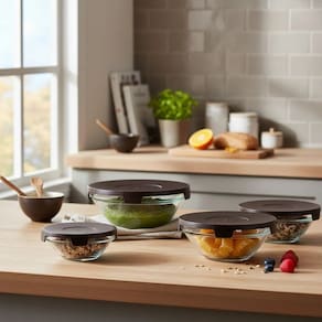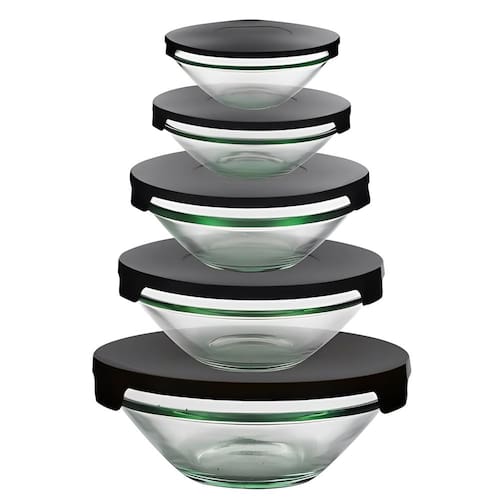 Organize sua cozinha com o Jogo de 5 Potes Organizadores de Vidro com Tampa Preta. Estes potes elegantes e funcionais são ideais para armazenar grãos, especiarias, e outros alimentos, mantendo-os frescos e protegidos. O design em vidro permite fácil visualização do conteúdo, enquanto as tampas pretas garantem um fechamento seguro e hermético. Transforme sua despensa em um espaço mais organizado e estiloso com este conjunto prático e durável.