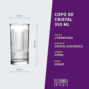 Jogo com 6 copos de cristal para água 350 ml vivant l'hermitage Jogo com 6 copos de cristal ecológico para água com 350 ml da linha vivant l'hermitage Detalhes do produto Material: cristal ecológico Produto: copos de cristal Quantidade: 06 copos Capacidade: 350 ml cada copo Tamanho: 14,5 cm de altura, 7,5 cm de diâmetro de bocal e 6,9 cm de diâmetro de base Marca: l'hermitage Linha: vivant Embalagem: os produtos são cuidadosamente envolvidos por plástico bolha e entregues na caixa do fabricante, inserida em outra caixa reforçada para assegurar a integridade do produto no transporte. Substituímos produtos danificados no transporte. Postamos nossos produtos nos correios de 01 a 02 após a compra. Todos os nossos produtos acompanham a impressa. Trocas e devoluções Seguimos todas as normas vigentes no código de defesa do consumidor. Adicionalmente, trocamos produtos danificados no transporte. Informações relevantes 1. Já imaginou beber ou servir suas bebidas em taças ou copos de cristal com classe e sofisticação A elleganza cristais comercializa produtos com preços excepcionalmente abaixo do mercado, sendo livre de materiais tóxicos, com design e transparência incríveis. 2. Mas cristal não quebra facilmente Não necessariamente, os cristais desta linha tem maior espessura e por isso, são bem mais resistentes que os cristais com menor espessura. Marca: Não Informado Ean: 7893220287039