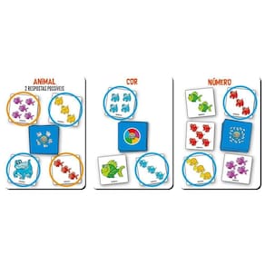 1 - cada jogador vira a carta de cima do baralho, colocando-a ao lado do monte2 - os próximos jogadores fazem o mesmo e continuam virando uma após outra, até achar um par que corresponda om a categoria que aparece na carta do topo do monte3 - para marcar pontos, o jogador deve achar pelo menos um par duas cartas que tenham a mesma categoria do topo do monte de cartas, ou seja: pelo menos 2 cartas com o mesmo animal, com a mesma cor ou a mesma quantidade.4- tente coletar o máximo de cartas e vença o jogoa partir de 5 anos 2 a 6 jogadorestempo estimado de jogo: 10 minutos
