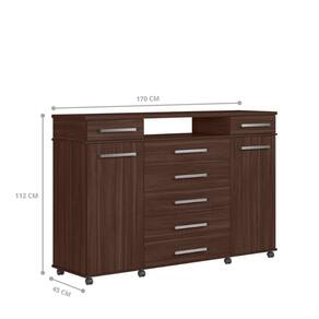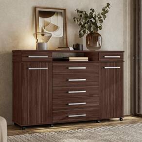 A cômoda é feita em MDP. Possui 7 gavetas, 2 porta e 1 nicho.