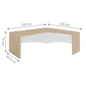 A mesa é feita em MDP, e contém o formato em L com seu design arredondado.