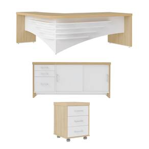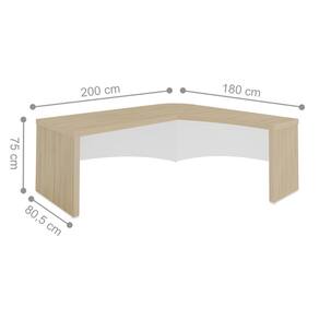 A mesa é feita em MDP, e contém o formato em L com seu design arredondado.