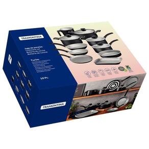 Praticidade, eficiência e alta qualidade com o jogo de panelas Tramontina Turim em alumínio com revestimento interno e externo em antiaderente Starflon Max preto 10 peças. Ideais para lhe acompanharem no preparo das refeições diárias, suas peças tem corpo de alumínio com espessura que proporciona cozimento rápido e uniforme e contam com revestimento interno e externo de antiaderente Starflon Max, material que não gruda, é fácil de limpar e mais durável. As panelas e as caçarolas que compõem o jogo contam com tampas de vidro temperado com bordas de aço inox e pegadores de nylon e todos os itens tem seus cabos ou alças em baquelite, material antitérmico que confere um manuseio confortável e mais seguro. Todas as peças podem ir à máquina de lavar louças e serem utilizadas nos fogões a gás, elétricos e vitrocerâmicos. Acompanha 1 unidade de cada item relacionado abaixo: Assadeira Rasa 28 cm 2 L Assadeira Redonda 22 cm 1,7 L Brasil Caçarola 18 cm 2 L Turim Caçarola 20 cm 2,8 L Turim Fervedor 12 cm 1,1 L Turim Frigideira 16 cm 0,4 L Turim Frigideira 20 cm 0,8 L Turim Panela 14 cm 0,8 L Turim Panela 16 cm 1,4 L Turim Panquequeira/ Tapioqueira 22 cm 0,6 L Turim Marca: Não Informado