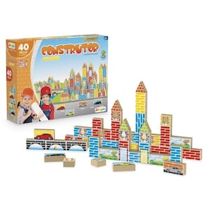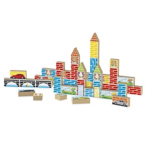 Produzido com bloquinhos de madeira MDF de reflorestamento, com 15 mm de espessura, o kit é composto por peças de diferentes formas e tamanhos, permitindo à criança montar a cidade que desejar.