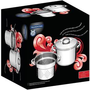 CARACTERÍSTICAS DO JOGO COZI-PASTA TRAMONTINA EM AÇO INOX FUNDO TRIPLO COM ALÇAS 2 PEÇAS - Mais saudável: por ser feita de aço inoxidável. a panela Tramontina não libera nenhum tipo de resíduo nas suas receitas; - Fácil de usar: uma panela prática para todas as suas receitas e que faz bonito em qualquer tipo de fogão: gás. elétrico. vitrocerâmico e indução; - Economiza tempo e energia: o segredo está no fundo triplo (aço inox + alumínio + aço inox). que distribui o calor uniformemente. proporcionando um cozimento mais rápido; - Por isso. você pode manter o fogo baixo durante todo o preparo e. assim. poupar energia. Além disso. a panela toda em aço inox pode ir ao forno para gratinar ou finalizar pratos. na temperatura máxima de 260C; - Fácil de limpar: deixar sua panela brilhando é simples. você só precisa de água. sabão e uma esponja macia. Se preferir. é só colocar na máquina de lavar.