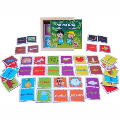 Jogo da Memória - Alfabetização - Ciabrink O Jogo da Memória é fabricado em madeira MDF contendo 52 peças. O Jogo da Memória é um divertido e animado jogo de memorização e concentração, onde o objetivo desta tradicional brincadeira é encontrar o máximo possível de pares figura e nome . Ref:. 1012. Utilizado pelos professores, o Jogo da Memória é um material apropriado para todos os métodos de ensino e aprendizagem. Desenvolve a noção de quantidades, atenção, memória, concentração, percepção visual, discriminação de figuras, e espírito de competição ocorrendo de uma maneira fácil e muito divertida. Medidas da caixa de madeira: 13x13x6 cm. Medidas de cada placa: 5x5 cm. Idade: a partir de 3 anos. INMETRO CE-BRI/ICEPEX-N 00934-29 NBR NM 300/2004 Ean: 7898911458477