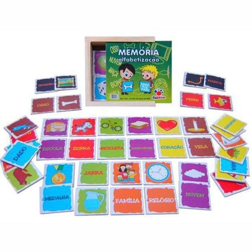 Jogo da Memória - Alfabetização - Ciabrink O Jogo da Memória é fabricado em madeira MDF contendo 52 peças. O Jogo da Memória é um divertido e animado jogo de memorização e concentração, onde o objetivo desta tradicional brincadeira é encontrar o máximo possível de pares figura e nome . Ref:. 1012. Utilizado pelos professores, o Jogo da Memória é um material apropriado para todos os métodos de ensino e aprendizagem. Desenvolve a noção de quantidades, atenção, memória, concentração, percepção visual, discriminação de figuras, e espírito de competição ocorrendo de uma maneira fácil e muito divertida. Medidas da caixa de madeira: 13x13x6 cm. Medidas de cada placa: 5x5 cm. Idade: a partir de 3 anos. INMETRO CE-BRI/ICEPEX-N 00934-29 NBR NM 300/2004 Ean: 7898911458477