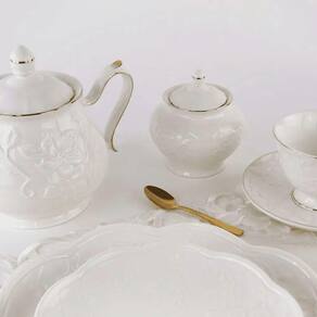 Reunir amigos e familiares em casa para um chá especial é um momento muito prazeroso e para isso, o jogo de chá garante que tudo seja muito bem servido em qualquer ocasião. Um belo jogo de porcelana é extremamente fino e acrescenta elegância aos eventos. O jogo tem detalhes delicados com filetes em dourados na borda, para deixar ainda mais charmoso.