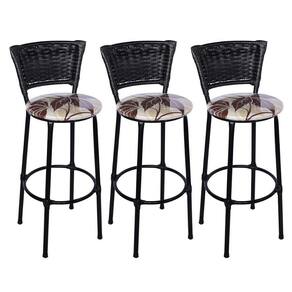 Jogo de 3 Banquetas Preta Junco Preto Assento Floral Marrom com Bistro Preto e Preto
