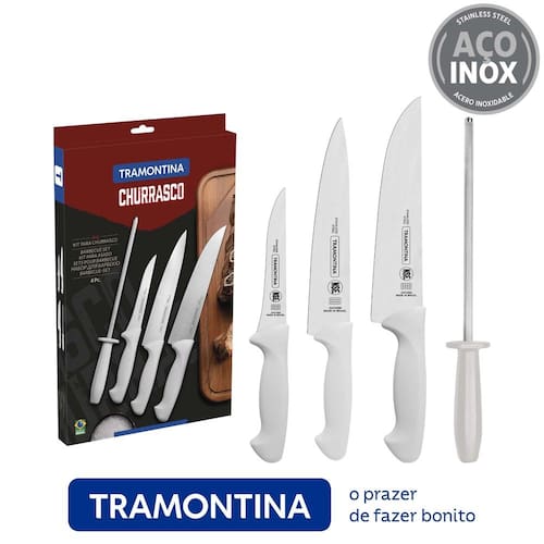 Para garantir a excelência no preparo e execução desta deliciosa tradição, a escolha certa é o jogo de facas para churrasco Tramontina em aço inox com cabo polipropileno 4 peças da linha Churrasco.