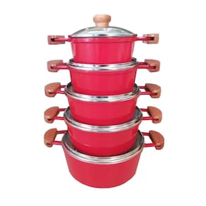 Mais luxo e requinte para sua cozinha, jogo com 5 peças de alumínio fundido na linda cor vermelho esmaltado, são 3 camadas de tinta e verniz para maior brilho e durabilidade.