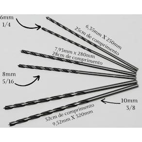 Jogo com 6 Brocas Mourão com qualidade de ponta a preço PROMOCIONAL por tempo limitado, garanta já o seu Novo lote de brocas de 3 pontas para madeira são desenvolvidas exclusivamente para furos em madeira sólida e compostos derivados. Feitas em aço carbono 45 de alta resistência com sua afiação exclusiva, garantem um melhor acabamento, alto poder de corte e grande durabilidade. 2 unidades de 6,35mm X 259mm 25cm comprimento 2 unidades de 7,93mm x 280mm 28cm comprimento 2 unidades de 9,52mm X 320mm 32cm comprimento Informações Adicionais Verifique o sentido de rotação Nunca exceda a RPM máximo e utilize as brocas somente em materiais de madeira. Excesso de rotação e avanço de corte podem comprometer a qualidade do furo e inutilizar as brocas Atenção, sempre utilize equipamento de EPI's no manuseio de equipamentos que possam oferecer algum tipo de risco a sua segurança. Para a HeMi Commerce a sua satisfação é muito importante, qualquer dúvida sobre o produto e compra estamos à disposição. do vendedor: 30 dias Marca: Não Informado