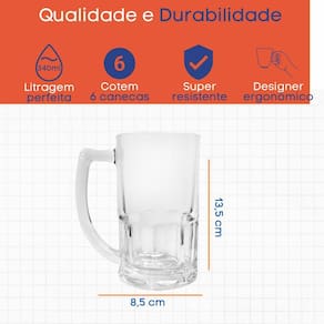 Jogo De 6 Canecas Chopp Vidro Copos Cerveja Festa 340Ml