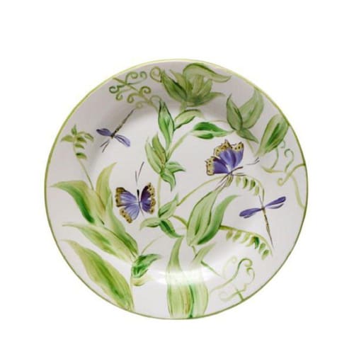 Jogo de pratos de jantar em cerâmica, com estampa de borboletas e libélulas, para deixar sua mesa ainda mais romântica.Peças em Cerâmica faiança, 100% artesanal de fabricação nacional, não refratária, produzida de acordo com as tradições de Indústria ceramista de Alcobaça / Portugal. Recomendado utilizar somente em forno convencional para aquecer o gratinar até 20 minutos a 180C. Peças podem conter variações de cores por ser um produto artesanal.Dimensões27 27 2 cm