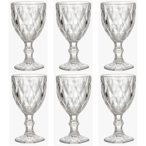 Jogo de 6 Taças Transparente 300ml Diamond Clear Ke Home REF: 88001 Lindas taças que expressam elegância e dão um toque charmoso a mesa. Combinam perfeitamente com elementos mais modernos e imprimem personalidade na decoração. - Dimensões da peça: 17 x 9cm • Capacidade: 300ml - Material: Vidro - Cor: Transparente - Contém: 6 Peças
