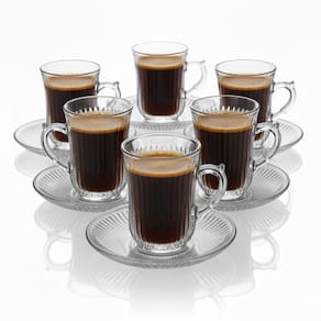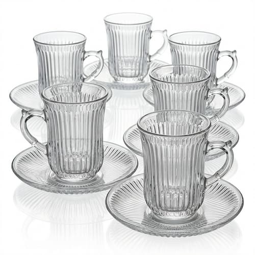 - Material: Vidro canelado na parte interna - Cor: Transparente - Quantidade: 6 Xícaras e 6 Pires - Embalagem: Caixa litografada