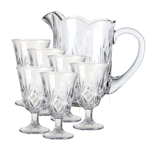 O conjunto inclui uma jarra e seis copos, perfeito para sucos, águas saborizadas e refrescos em momentos especiais.