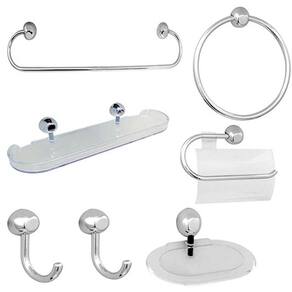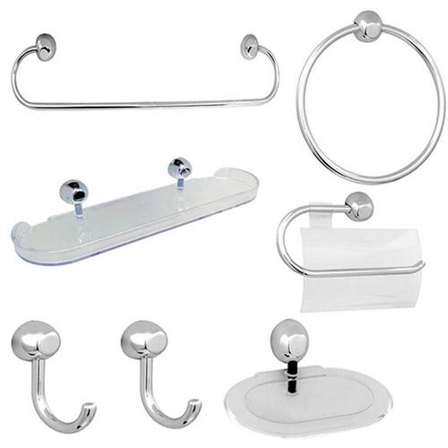 Todos possuem dupla fixação e são fabricados em plástico ABS, o kit samba possui um total de 7 peças: cabides, porta toalhas, saboneteira, prateleira para box e papeleira com tampa.