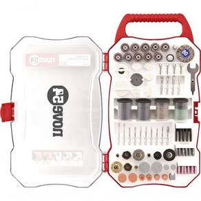 1 Jogo de acessórios para microrretífica, composto por um estojo plástico com 208 peças, sendo: 1 bastão abrasivo, 1 chave para microrretífica, 4 cilindros de feltro, 81 discos de corte, 44 discos de lixa, 1 escova circular de latão com haste, 3 escovas pincéis de inox com haste, 2 escovas pincéis de latão com haste, 3 escovas pincéis de nylon com haste, 2 hastes para lixa cilindro, 2 hastes para disco de corte, 1 haste para disco de feltro, 1 haste para roda de pano, 6 limas rotativas, 4 limas rotativas diamantadas, 20 lixas cilindro, 1 pasta para polimento, 4 pinças para microrretífica, 1 ponta com feltro, 10 pontas montadas, 6 rebolos de carbureto de silício, 6 rebolos de óxido de alumínio, 1 roda de borracha, 1 roda de feltro, 1 roda de lixa e 1 roda de pano