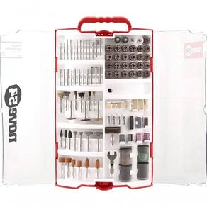 1 Jogo de acessórios para microrretífica, composto por um estojo plástico com 257 peças, sendo: 1 bastão abrasivo, 1 chave para microrretífica, 4 cilindros de feltro, 81 discos de corte, 44 discos de lixa, 3 escovas de latão, 3 escovas de inox, 3 escovas de nylon, 2 hastes para disco de corte, 1 haste para disco de feltro, 4 hastes para lixa cilindro, 3 hastes para roda de borracha, 1 haste para roda de pano, 10 limas rotativas, 10 limas rotativas diamantadas, 50 lixas cilindro, 1 pasta para polimento, 4 pinças para microrretífica, 1 ponta com feltro, 10 pontas montadas, 6 rebolos de carbureto de silício, 6 rebolos de óxido de alumínio, 2 rodas de borracha, 4 rodas de feltro, 1 roda de lixa e 1 roda de pano