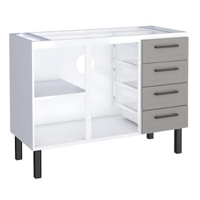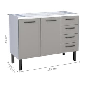 Balcão feito em Aço eletrogalvanizado. Possui 2 portas, 4 gavetas com corrediças telescópicas e divisor de talheres e1 prateleira