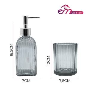 Organiza e dispensa itens de higiene pessoal, como sabonete líquido e acessórios, por meio de um conjunto de duas peças fabricadas em vidro na tonalidade cinza. O material de vidro contribui para a higiene, pois não absorve odores, não reage com os produtos e facilita a limpeza e manutenção, auxiliando na conservação dos itens armazenados.