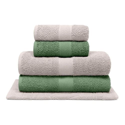 Jogo de Banho C/5 Peças Natural Gigante Cor Oliva/Bege Jogo de Toalhas 5 peças, sendo 02 Toalhas de Banho Gigante Natural, 02 Toalhas de Rosto Natural em 100% Algodão, e 1 Toalha de Piso Pezinhos, 100% Algodão, com 500g-m da linha Nobre e da marca Buettner por Bouton. Produzida em teares especiais que possibilitam desenvolver desenhos tanto no corpo quanto nas barras das toalhas. A toalha Natural possui o corpo da com efeito de 'coco ralado', criando uma sensação de maciez e conforto no uso. Esta toalha é especial para o dia-a-dia, tem excelente absorção e é muito gostosa para se enxugar. A toalha Natural da Buettner é a famosa 'Toalha Ecologicamente Correta', com anos de tradição e a mais de 20 anos sendo produzida. Contém: 02 Toalhas de banho gigante natural tamanho: 81 cm x 1,50 m; 02 Toalhas de rosto natural Tamanho: 50 cm x 80 cm; 01 toalha de piso pezinhos Tamanho: 45 cm x 70 cm; Descrição: Na cor bege: 01 toalha de banho, 01 toalha de rosto e 1 toalha de piso pezinhos; Na cor Verde Oliva: 01 toalha de banho e 01 toalha de rosto; Fibra toalhas natural: 100% algodão; Fibra piso pezinho: 100% algodão; Gramatura toalhas natural: 500g-m;