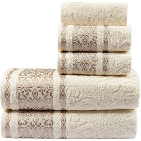 Marca: Bia Enxovais | Estampa: Não se Aplica | Medidas: 02 Toalhas de Banho 1,50m x 75cm02 Toalhas de Rosto 70cm x 50cm01 Piso 75cm x 50cm | Número de Peças: 05 Peças | Material: Agodão | Cor Predominante: Bege | Cama Indicada: Não se Aplica