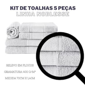 As toalhas do Jogo de Banho Noblesse possuem relevo em flocos e uma linda barra decorativa, o que confere um toque de elegância ao jogo. Além disso, esse conjunto é composto por 5 peças e suas medidas aproximadas são: