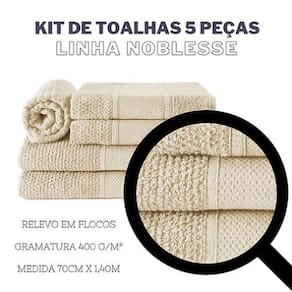 As toalhas do Jogo de Banho Noblesse possuem relevo em flocos e uma linda barra decorativa, que adicionam um toque de elegância ao ambiente. O jogo é composto por 2 toalhas de banho de 1,40m x 70cm, 2 toalhas de rosto de 50cm x 80cm e 1 toalha para pés piso de 50cm x 70cm.
