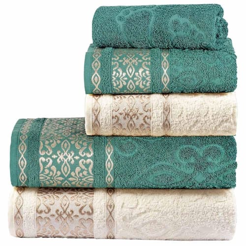 Contém na Embalagem: 02 Toalhas de banho 1,50m X 75cm 02 Toalhas de rosto 80cm X 50cm 01 Piso 75cm X 50cm