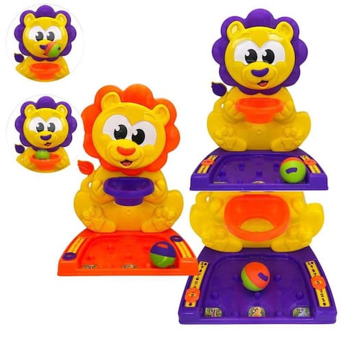 Conta com um marcador de pontos nas laterais e na parte inferior, adicionando um toque de competição saudável. A cabeça do leão se move, deixando o jogo mais dinâmico. Acompanha uma bolinha especial que faz barulho ao ser movimentada, sendo ideal para as mãos pequenas das crianças.