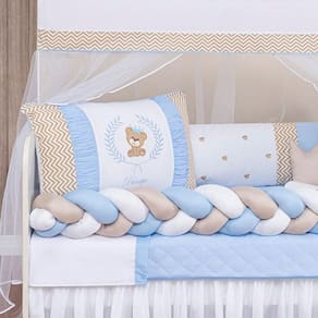 Jogo de Berço Kids Ursinho Ted e Trança Lateral Para Menino 14 Peças Completo Azul Claro Saia Box Lençol Extra TOTAL 14 PEÇAS 1 Edredom 130cm x 75cm1 Cabeceira 0.60 X 0.40 1 Lateral 1.28 X 0.251 Trança 1.28 X 0.12 1 Fronha 0,28 x 0,38 1 Lençol de Cima com Bainha1 Bando do mosqueteiro 1.40 x 0.20 1 Mosqueteiro 4.50 x 1.50 1 Almofada 0.40 x 0.30 1 Trocador 0,60 x 0,45 1 SAIA BOX 1,30 x 0,70 x 0,30 1 lençol de cima 1,20m x 0,80 cm.1 Protetor impermeável para berço americano 1,30m X 0,80cm.1 Travesseiro 0,30cm x 0,40 COMPOSIÇÃO: Tecido estampado: 100% algodão.Tecido colorido: 100% poliéster.Tecido lençol : 50% algodão 50% poliéster.Tule : 100% poliamida.Plástico: 100% PVC.Enchimento: 100% poliéster. edredom dupla face todo matelado com várias costuras.Laterais e cabeceiras com zíper para facilitar a lavagem de seu produto.