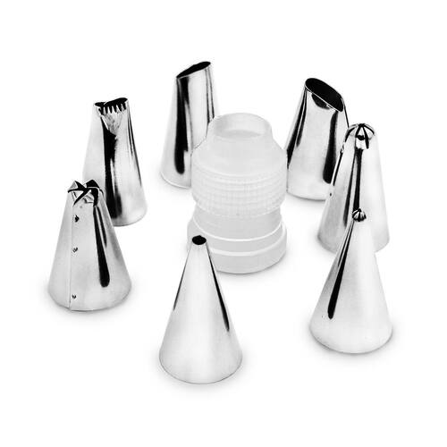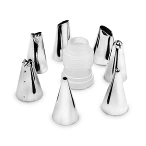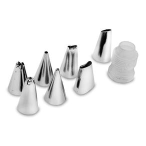 Com um total de 8 peças, este kit de bicos para confeitar é uma excelente opção para quem precisar realizar uma decoração rápida e pratica em bolos, doces, sobremesas e tortas com natas ou creme, para rechear pastéis com compota e para decorar sanduíches e canapés com pastas, queijo fundido, etc. Este kit para decorar bolo vem com 07 bicos em inox, sem emendas, 01 adaptador em plástico. Características: