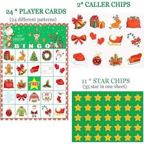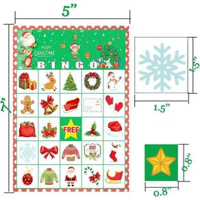 - Conjunto de bingo de Natal: o pacote inclui 24 cartas exclusivas para jogadores de bingo de Natal para crianças, 385 fichas de marcação (11 folhas) e 2 fichas de chamada. Jogo de bingo de Natal para grandes grupos jogarem, ótimo jogo para famílias e mamães.
