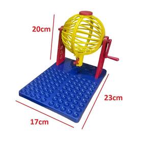 Contém: 48 cartelas com números, 01 base plástica para colocação das bolinhas, 01 globo giratório, 90 bolinhas numeradas.