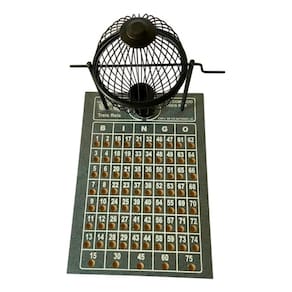 Jogo de bingo completo com globo em metal, tabuleiro em madeira MDF com cavidades numeradas para as bolinhas sorteadas e 75 bolinhas de plástico numeradas e com letras. A numeração é feita da seguinte forma: