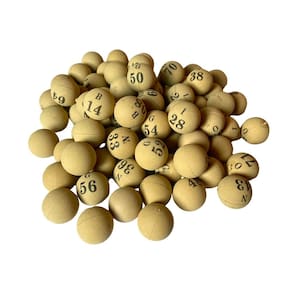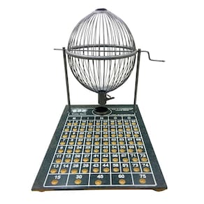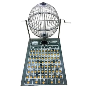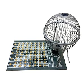 Jogo de bingo completo com globo em metal, tabuleiro em madeira MDF com cavidades numeradas para as bolinhas sorteadas e 75 bolinhas de plástico numeradas e com letras. A numeração é feita da seguinte forma: