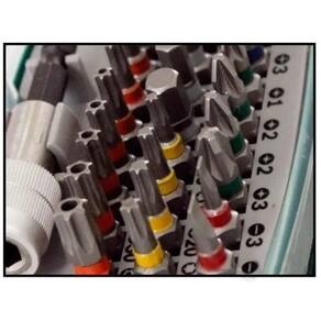 Características: - Kit Promoline colorido com 32 peças. - Acompanha Estojo Plástico emborrachado. - Pontas de qualidade profissional com marcação por cores. Acompanha:- 1 Estojo. - 1 Engate Rápido. - 4 Pontas Philips: 1, 2, 2 E 3. - 4 Pontas Phz: 1, 2, 2 E 3. - 4 Pontas Fenda: 3, 4, 5 E 6. - 4 Pontas Hexagonais: 3, 4, 5 E 6. - 8 Pontas Torx Sem Furo: T10, 15, 20, 20, 25, 27, T30 E T40. - 7 Pontas Torx Com Furo: T10, 15, 20, 25, 27, 30 E T40.