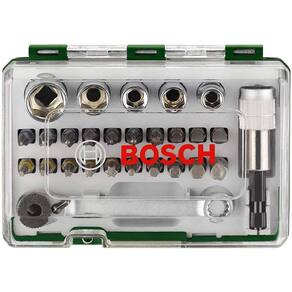 Jogo De Bits E Soquetes com Catraca 27 Peças - BoschOs Kits de Pontas e Soquetes Bosch Extra Hard são ideais para aplicações universais de parafusamento e fixação.As Pontas e Soquetes são fabricados com aço de alta qualidade com processo de tratamento térmico que traz alta resistência e permite um alto desempenho nas aplicações. A zona de torção cônica das pontas absorve a força e vibração durante as aplicações executando todos os parafusamentos com facilidade.O portfólio Bosch Extra Hard é completo e possui Pontas Philips PH , Pozidriv PZ , Torx T , Fenda S e soquetes em diferentes diâmetros com encaixe hexagonal 1/4. São indicados para utilização em furadeiras e parafusadeiras. CONTEÚDO DA EMBALAGEM- 1 Estojo- 19 Bits de 25 mm: Ph 1 / 2 / 2 / 3, Pz 1 / 2 / 3, Fen 4 / 5 / 6, Torx 10 / 15 / 20 / 25 / 30, Hex 3 / 4 / 5 / 6,- 1 Minichave de catraca- 1 Adaptador multi-fit- Soquetes 6 / 7 / 8 / 10 / 13 mm + adaptador