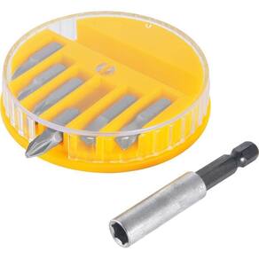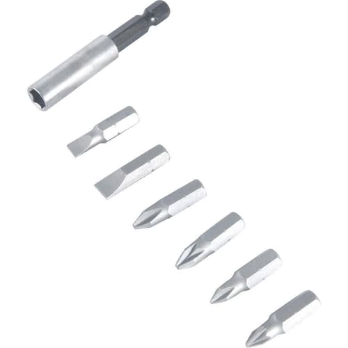 1 Jogo de bits/ponteiras, composto por 7 peças, sendo: 2 bits/ponteiras fenda simples (5 mm e 7 mm), 2 bits/ponteiras fenda cruzada/phillips (PH1 e PH2), 2 bits/ponteiras Pozidrive (PZ1 e PZ2) e 1 adaptador com encaixe magnético