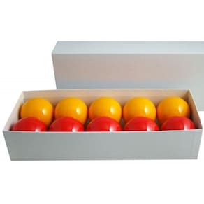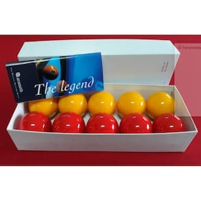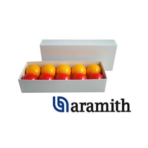 Considerada a melhor bola do mundo. Melhor resistência e longevidade; Testada nos seguintes aspectos: equilíbrio, esfericidade, cor, brilho, densidade, diâmetro, dureza e peso; Conjunto contendo 10 bolas, nas cores: Vermelha (5) e Amarela (5). Material: resina fenólica Aramith. Tamanho: 54 mm. Peso total: 2 kg Peso individual: 140 g